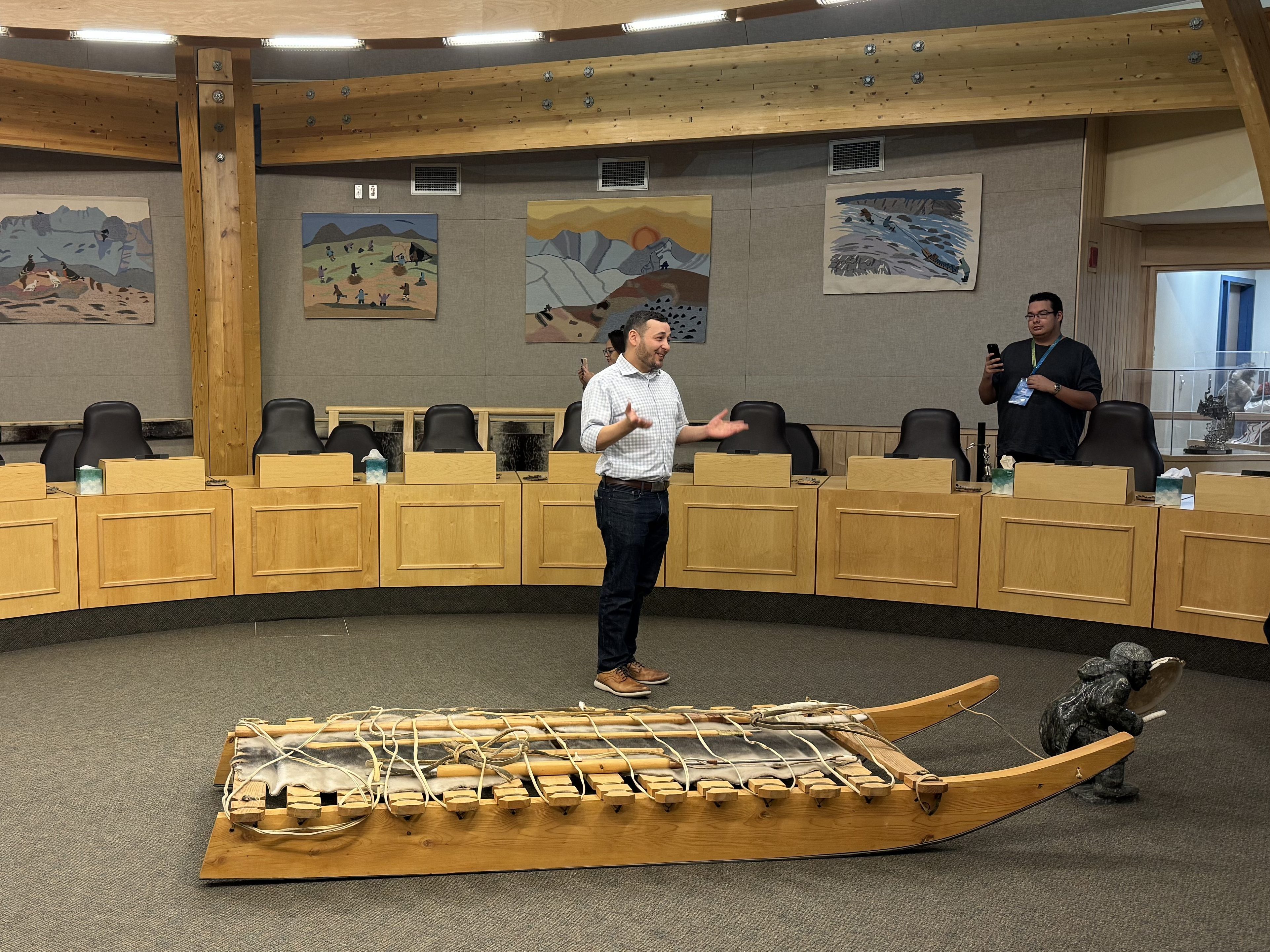 The building itself is a cultural treasure, making it a must-see for history and culture enthusiasts. In the lobby, you’ll find a gallery full of Inuit art, as well as the Mace of Nunavut, a stunning piece carved from narwhal ivory and adorned with materials sourced from across the territory. The chamber is shaped like an igloo (and often referred to as “the people’s igloo”), with walls adorned by Inuit art and seats upholstered in seal skin.