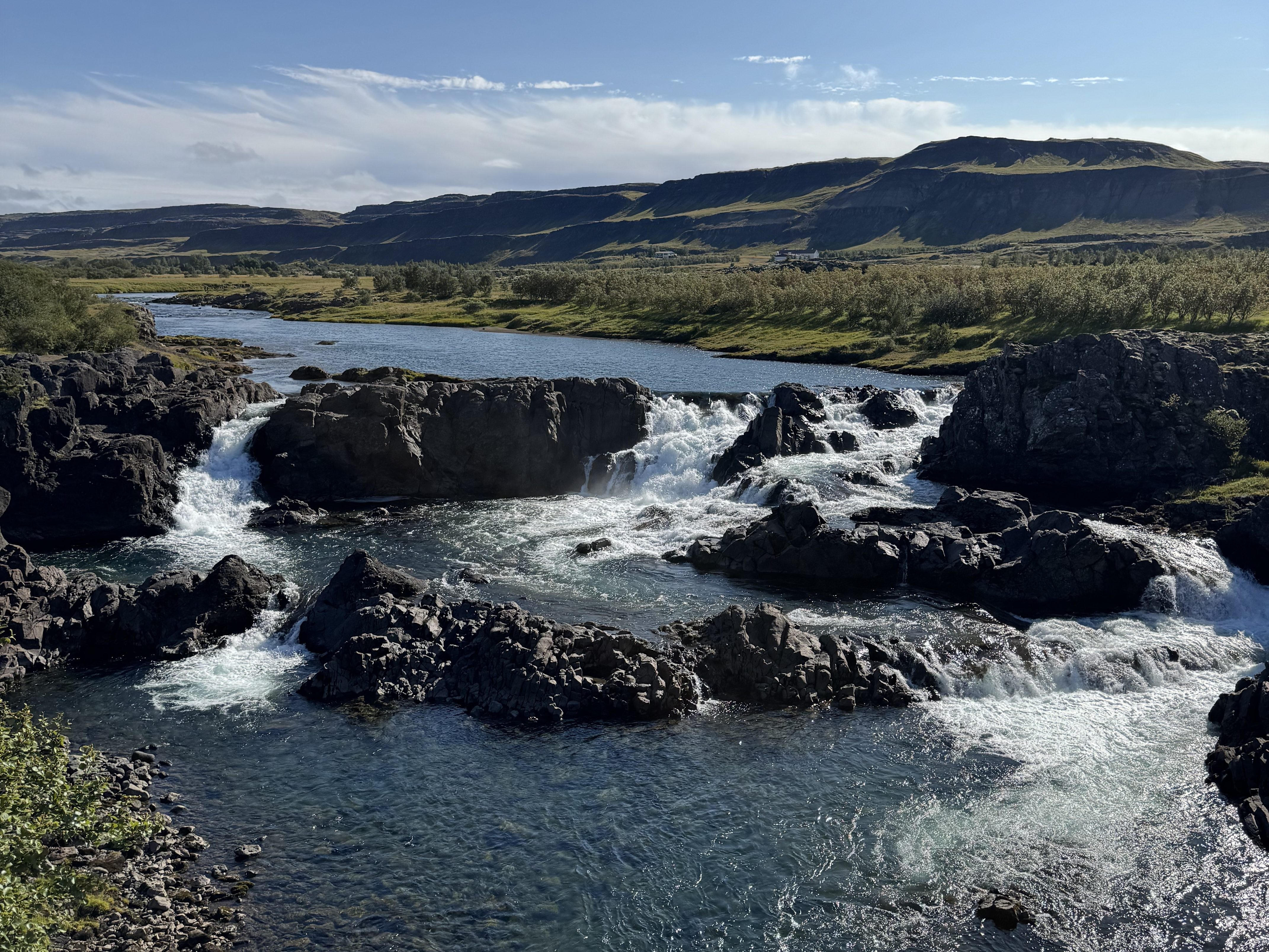Our first stop was Glanni, a waterfall on the Norðura River near Bifröst. It cascades through the Grábrók lava field, created over 3,000 years ago by a fissure eruption. Its name can mean “the Daring One” or “the Reckless.” According to folklore, Glanni is home to both trolls and the hidden people (Huldufólk), adding mystery to its beauty.