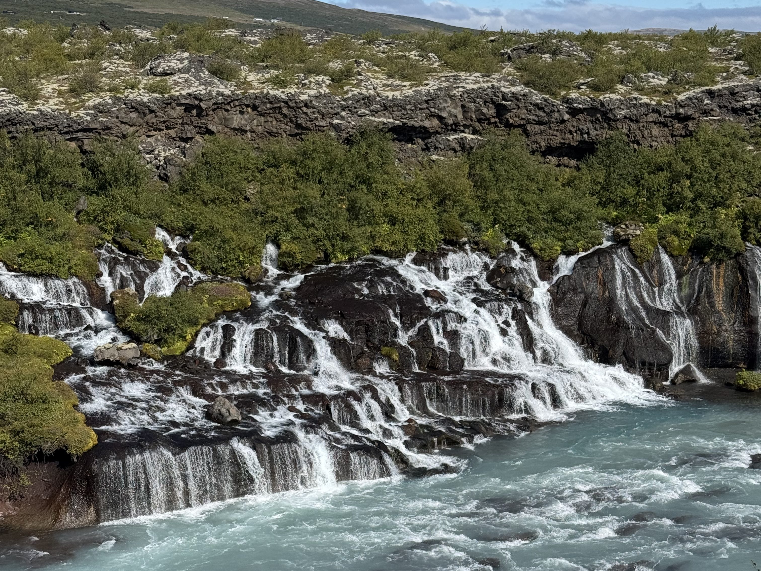 Hraunfossar, or “Lava Falls,” quickly became my favorite in Iceland. Unlike most waterfalls, it doesn’t fall from cliffs but seeps through porous lava rock. The water, coming from the Langjökull Glacier, flows nearly 1 km underground through the Hallmundarhraun lava field before cascading into the Hvítá River.